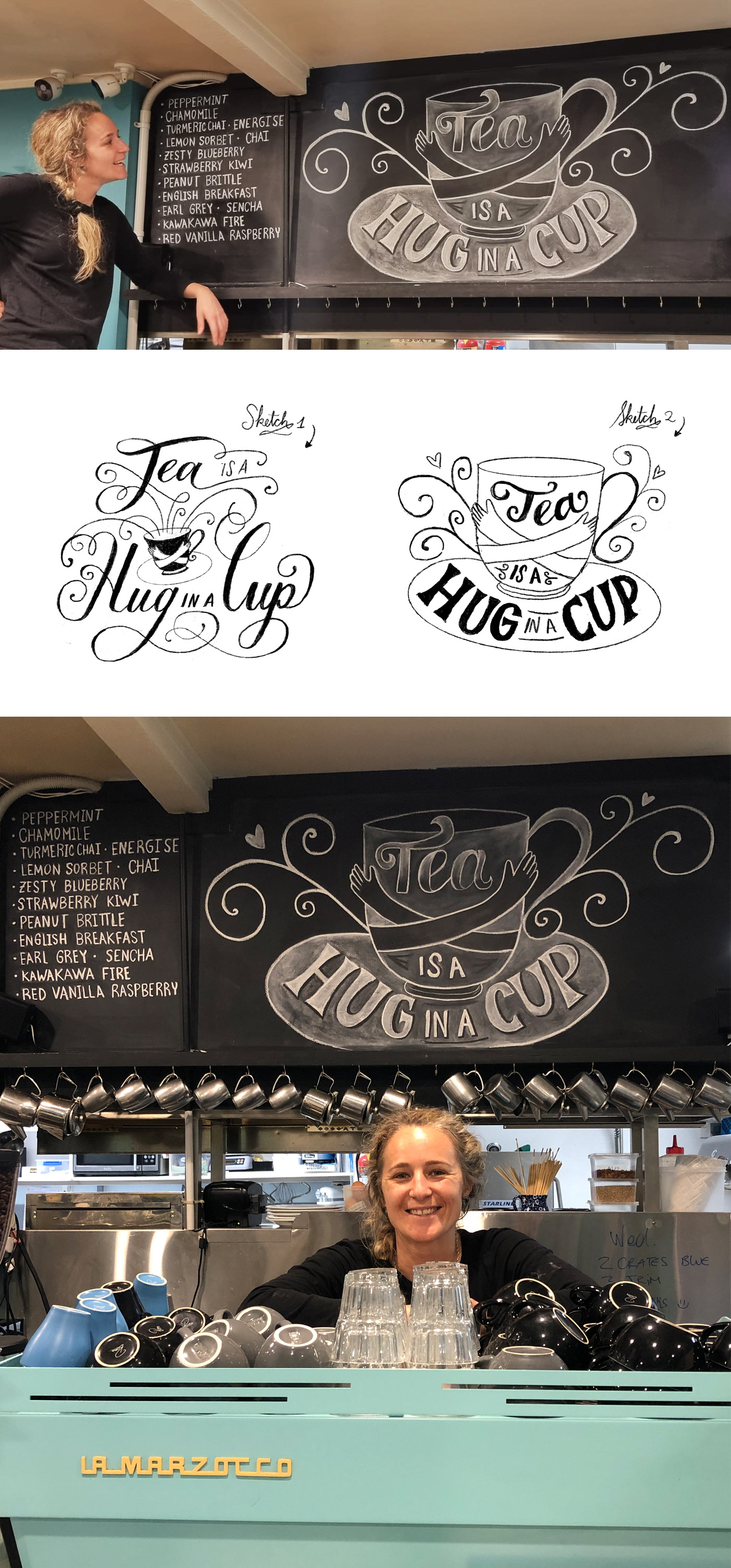 Chalkboard mural created for Deck Chair Café, a busy café in Mount Maunganui, New Zealand. The mural was made to promote the beautiful NZ tea brand called Tea Leaf.